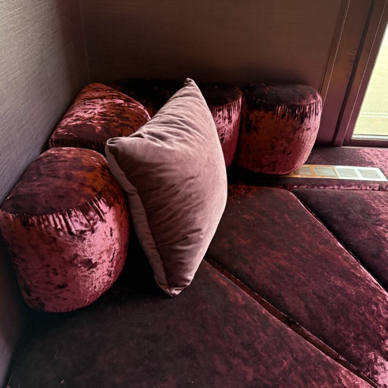 Zowel de bank als de houten ombouw van de bar zijn volledig in eigen huis gebouwd en gestoffeerd.
